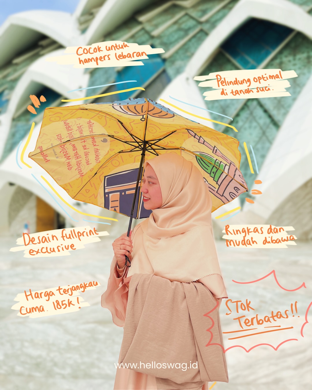 Payung fullprint dengan desain khas Tanah Suci ini bukan cuma pelindung dari panas dan hujan, tapi juga jadi teman perjalanan yang bikin momen ibadah makin berkesan.